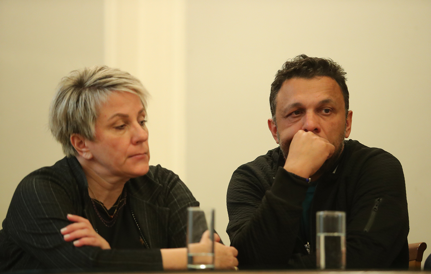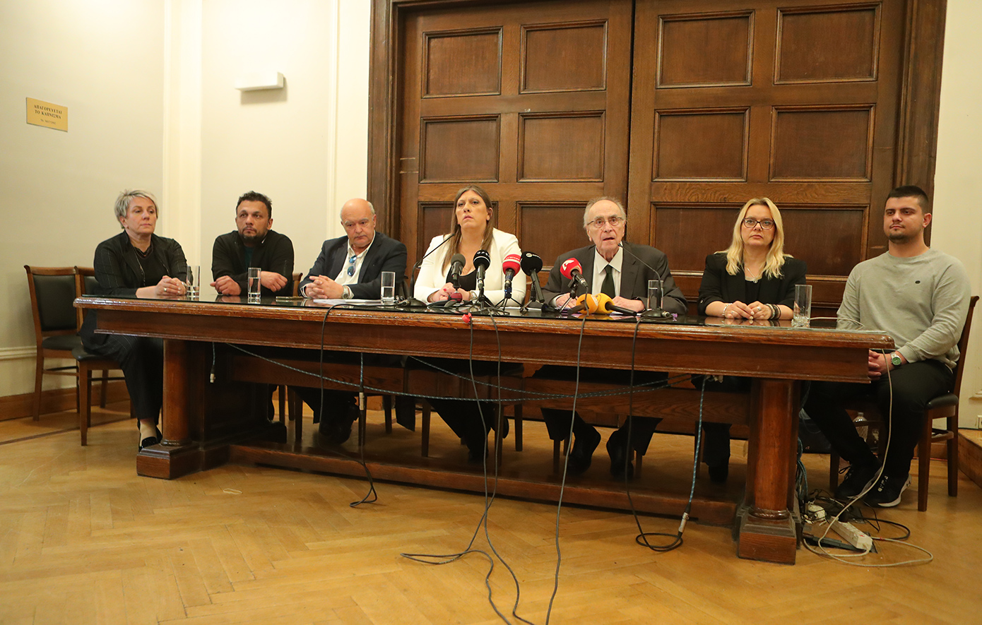 Παρουσία των οικογενειών Ρούτσι, Παπαγγελή, Δουρμίκα και Γεωργούση, συγγενείς θυμάτων των Τεμπών, οι δύο δικηγόροι εξαπέλυσαν σφοδρή επίθεση κατά του υπουργού Δικαιοσύνης, του προέδρου της ΕνΔΕ Χριστόφορου Σεβαστίδη, του προέδρου του ΔΣΑ Ανδρέα Κουτσόλαμπρου, αναφερόμενοι σε «κρατικό έγκλημα» και συντονισμένη «κυβερνητική προπαγάνδα» που επιχειρεί να «μπαζώσει την υπόθεση» και να «εξουθενώσει τους συγγενείς».
