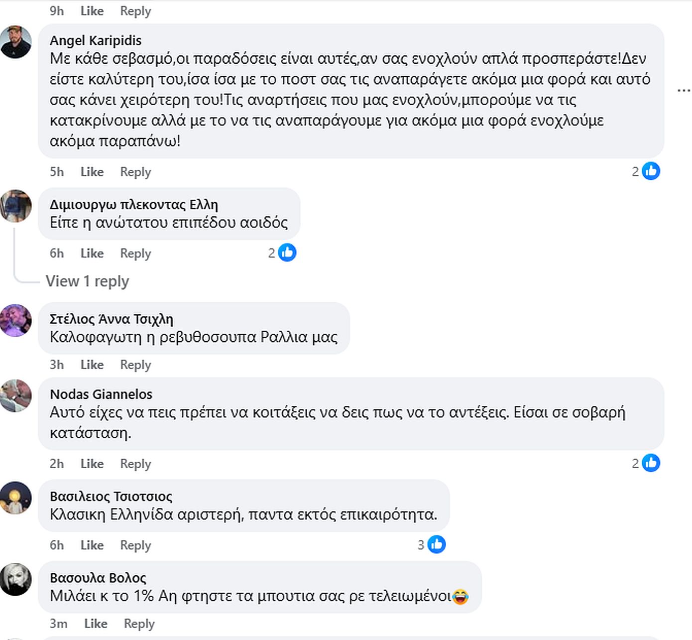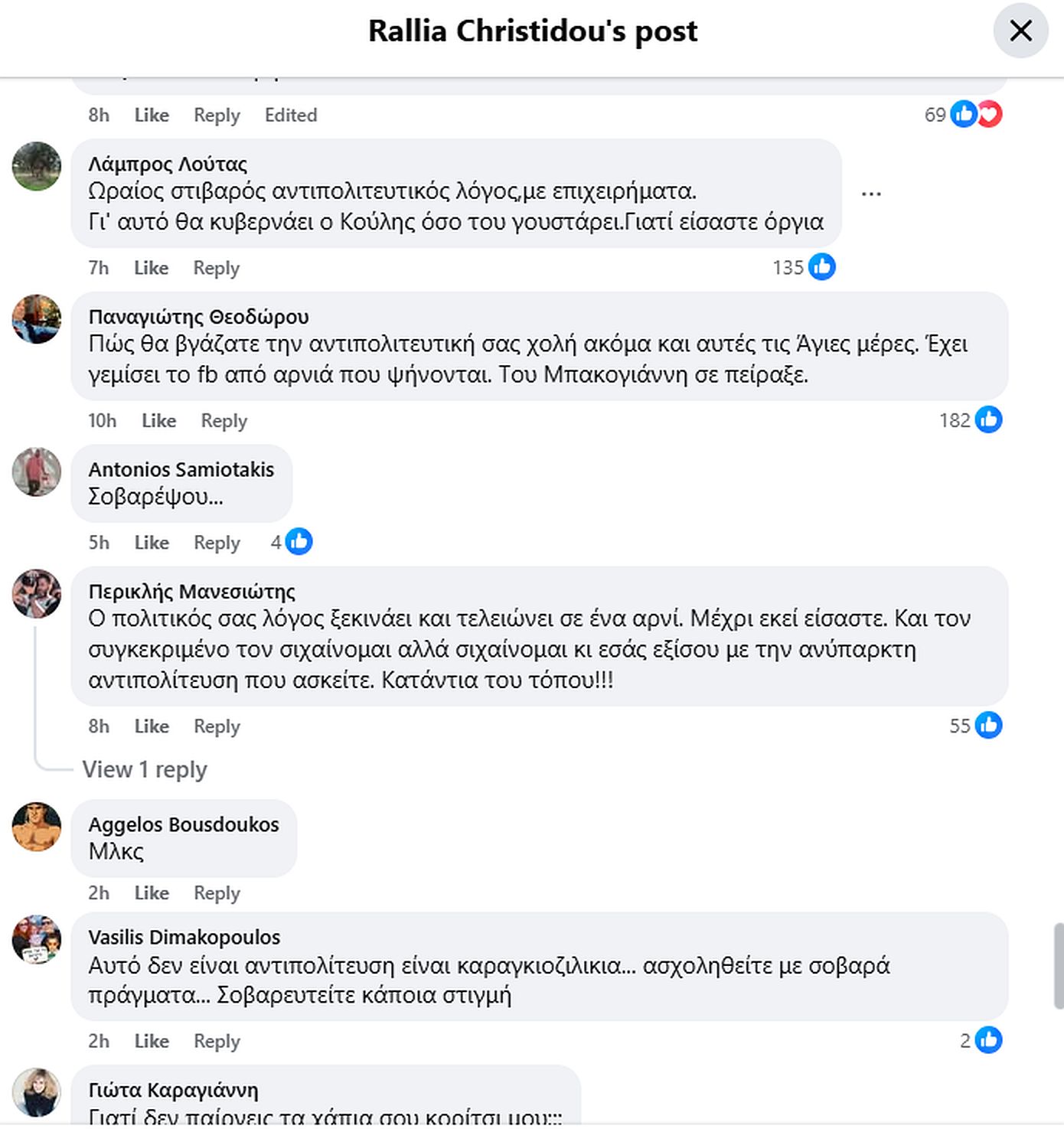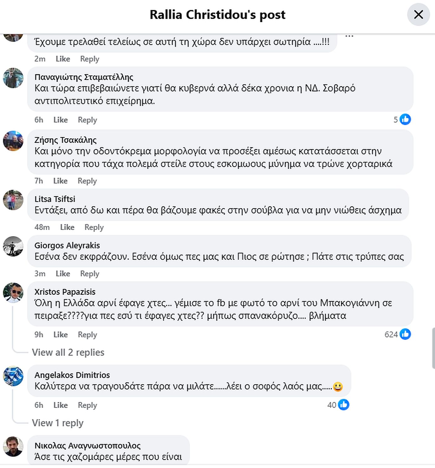 Η ανάρτηση προκάλεσε πλήθος σχολίων, αρκετά εκ των οποίων ασκώντας έντονη κριτική στην τοποθέτηση της Ραλλίας Χρηστίδου, με χρήστες να κάνουν λόγο για υπερβολική αντίδραση και αποσύνδεση από το εορταστικό έθιμο του Πάσχα.
