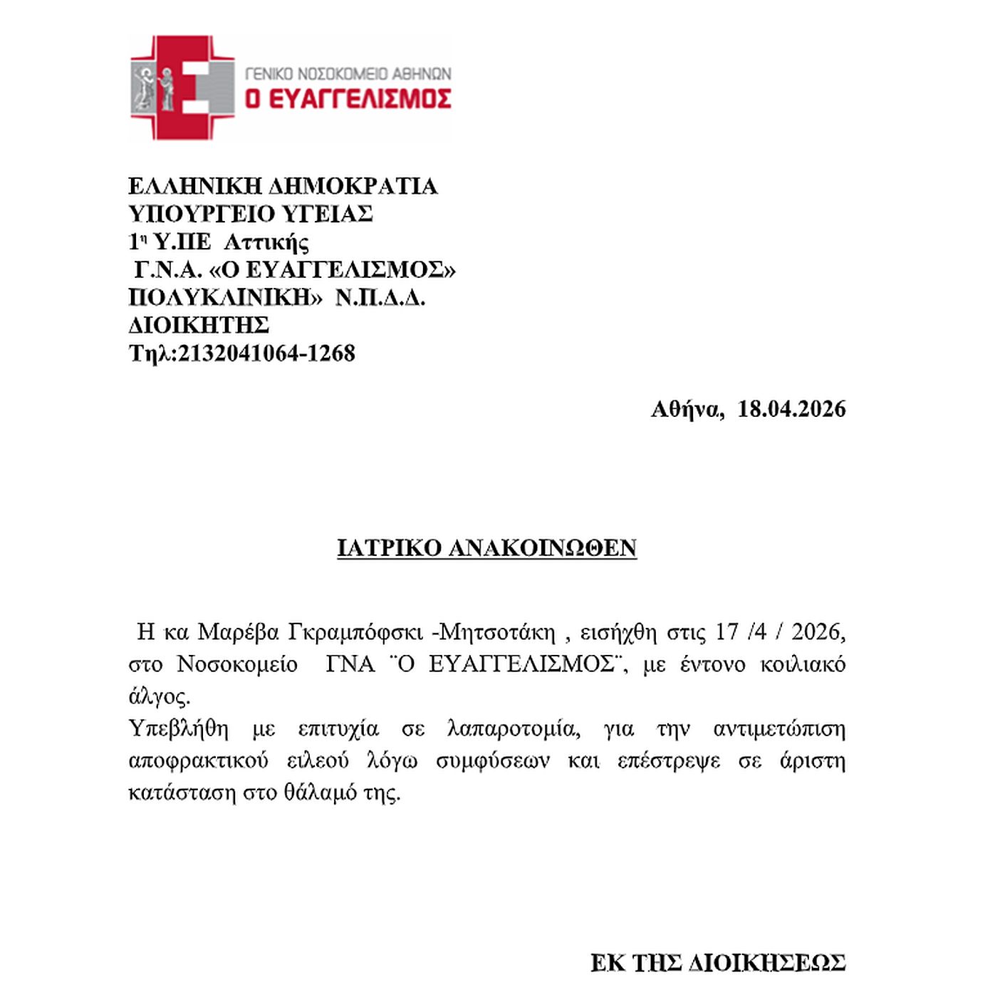 Η Μαρέβα Γκραμπόφσκι – Μητσοτάκη, εισήχθη την Παρασκευή (17/4), στο Νοσοκομείο Ευαγγελισμός, με έντονο κοιλιακό άλγος.