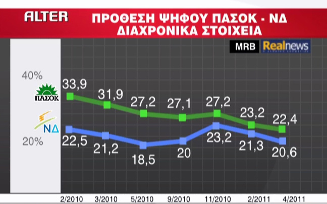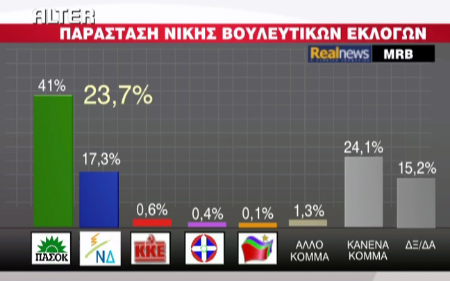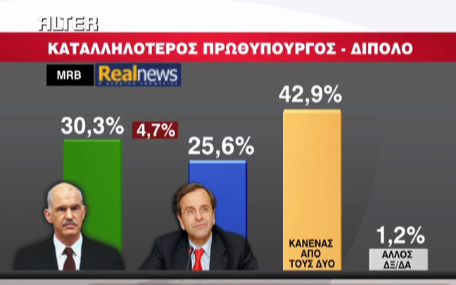 Το 41% πιστεύει πως αν γίνουν αύριο εκλογές θα τις κερδίσει το ΠΑΣΟΚ ενώ τη Ν.Δ. βλέπει μπροστά μόλις το 17,3%. Ως καταλληλότερος πρωθυπουργός κερδίζει ο «κανένας» με 42,9% ενώ ο Παπανδρέου και ο Σαμαράς συγκεντρώνουν μόλις 30,3% και 25,6% αντίστοιχα.