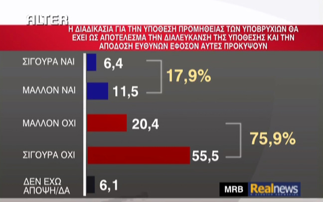 Τέλος, μόλις το 17,9% των ερωτηθέντων πιστεύει ότι μπορεί να διαλευκανθεί η υπόθεση με το σκάνδαλο των υποβρυχίων.