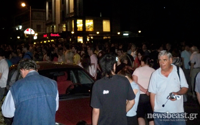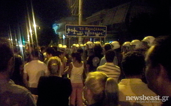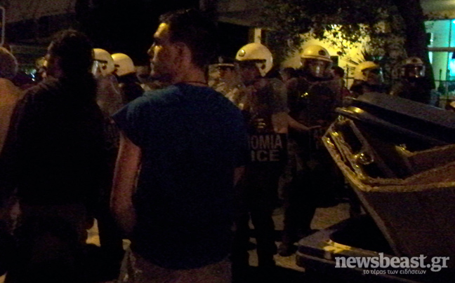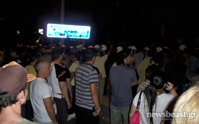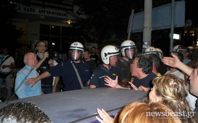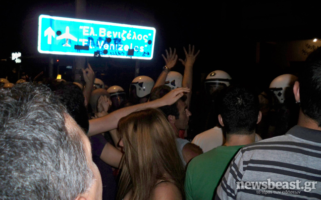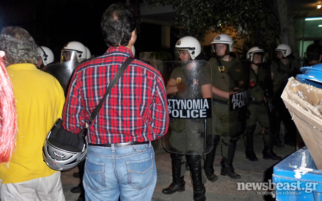 Οι διαδηλωτές φωνάζουν συνεχώς συνθήματα, όπως «κλέφτες», πετούν αναπτήρες και μουτζώνουν προς τη μεριά του κτιρίου όπου βρίσκεται ο Γ. Πεταλωτής.