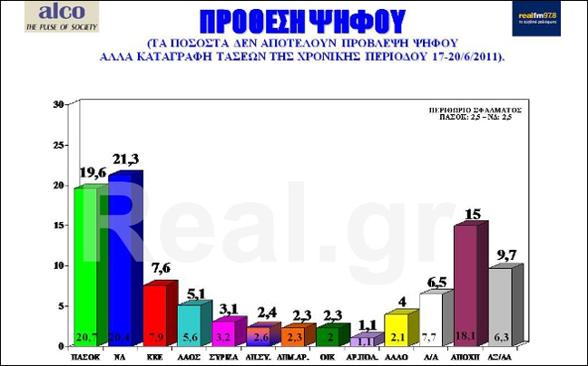 Συγκεκριμένα, το κόμμα της αξιωματικής αντιπολίτευσης συγκεντρώνει 21,3% και το ΠΑΣΟΚ 19,6%. Ακολουθούν ΚΚΕ 7,6%, ΛΑ.Ο.Σ. 5,1%, ΣΥΡΙΖΑ 3,1%, ΔΗ.ΣΥ. 2,4%, Δημοκρατική Αριστερά 2,3%, Οικολόγοι 2,3%, Άρμα Πολιτών 1,1%.