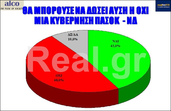 Ωστόσο, το 36% δηλώνει ότι δεν γνωρίζει ποιος από τους δύο πολιτικούς αρχηγούς φέρει την ευθύνη του αδιεξόδου. Στο ερώτημα αν θα μπορούσε να δώσει λύση μία κυβέρνηση ΠΑΣΟΚ – ΝΔ. Αρνητικά απαντά το 48% και θετικά το 42%.