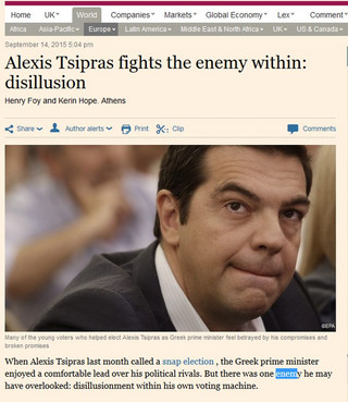 «Πολλοί από τους νεαρούς ψηφοφόρους που έδωσαν την εξουσία στον ΣΥΡΙΖΑ πριν από εννιά μήνες νιώθουν επίσης προδομένοι από τους συμβιβασμούς του κ. Τσίπρα και την αθέτηση των υποσχέσεων. Ο πρωθυπουργός ήρθε στην εξουσία ως ένας εμπρηστικός μαχητής κατά της λιτότητας αλλά την παραδίδει ως ένας καθυποταγμένος πραγματιστής», σημειώνουν οι FT και προσθέτουν: