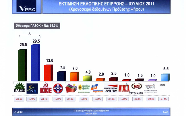 Σύμφωνα με τη δημοσκόπηση η Ν.Δ. προηγείται με 29,5% και ακολουθούν το ΠΑΣΟΚ με 25,5%, το ΚΚΕ με 13%, ο ΛΑΟΣ με 7,5%, ο ΣΥΡΙΖΑ με 7% και οι Οικολόγοι – Πράσινοι με 4%.