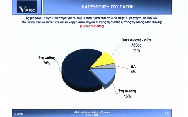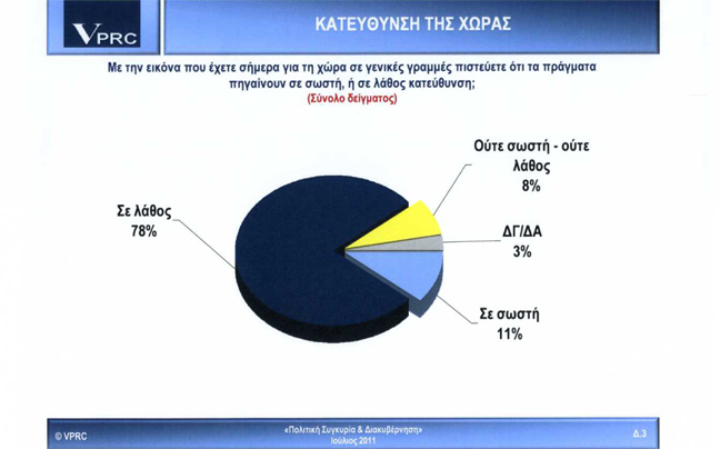 Το 78% των ερωτηθέντων εκτιμά πώς η χώρα κινείται προς την λάθος κατεύθυνση, ενώ μόλις το 11% υποστηρίζει ότι κινούμαστε προς τη σωστή.