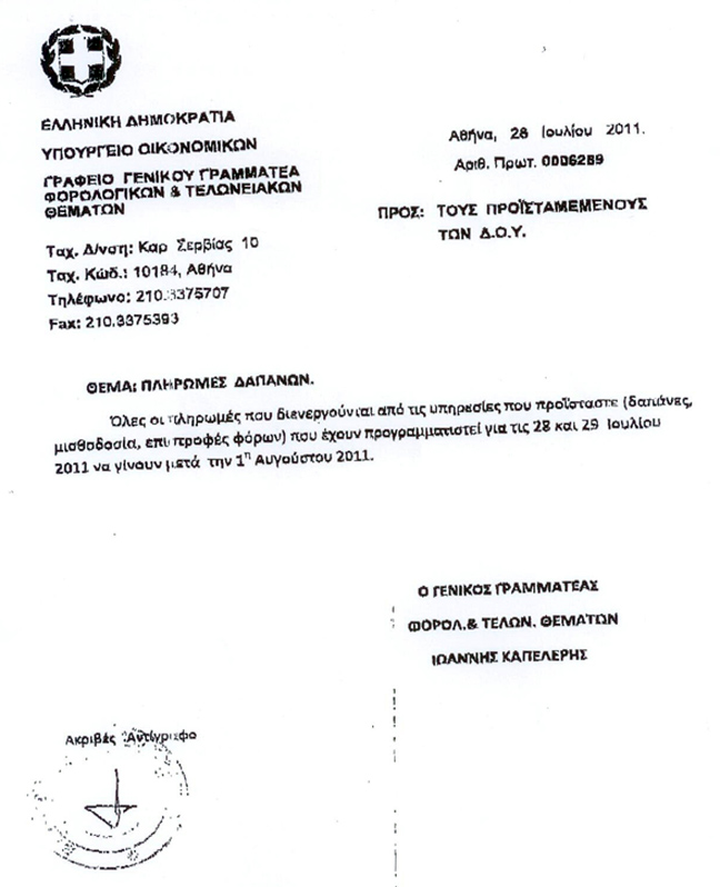 «Η υπ’ αριθμ. 0006289/ 28-07-2011 πρωτοφανής οδηγία του Υπουργείου Οικονομικών, που εστάλη σήμερα προς τις ΔΟΥ όλης της χώρας, σχετικά με την αναστολή όλων των πληρωμών μισθοδοσίας και επιστροφής φόρων, προκαλεί έκπληξη και δημιουργεί εύλογα ερωτηματικά.