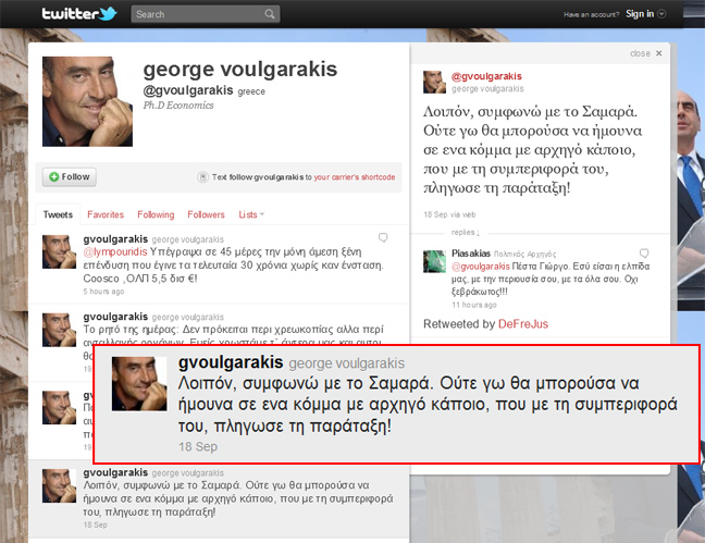 «Λοιπόν, συμφωνώ με το Σαμαρά. Ούτε εγώ θα μπορούσα να ήμουνα σε ένα κόμμα με αρχηγό κάποιον, που με τη συμπεριφορά του, πλήγωσε τη παράταξη» έγραψε χαρακτηριστικά ο Γιώργος Βουλγαράκης.