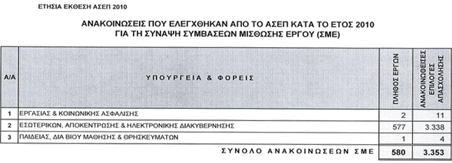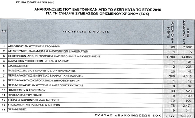 Γι’ αυτό, θέτουμε –για μια ακόμη φορά- το επίμαχο ερώτημα: Διαψεύδει –ναι ή όχι;- ότι, όπως προκύπτει από την έκθεση του ΑΣΕΠ, το 2010 καλύφθηκαν 25.850 θέσεις με συμβάσεις εργασίας ορισμένου χρόνου και 3.353 θέσεις με συμβάσεις έργου;