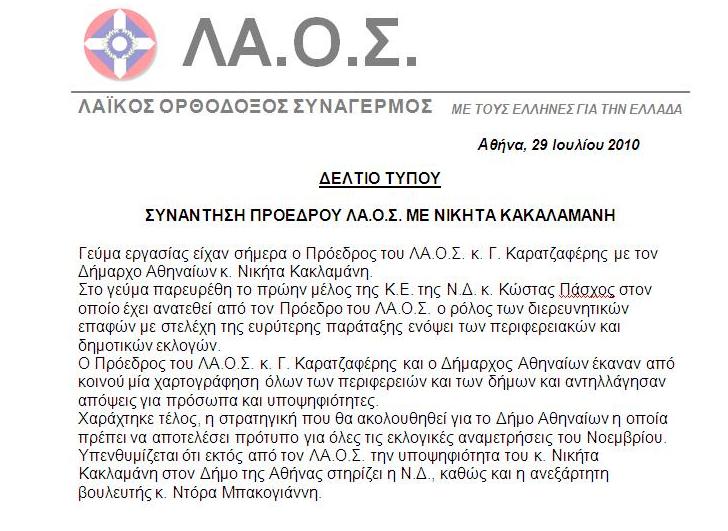 Υπενθυμίζεται ότι εκτός από τον ΛΑ.Ο.Σ. την υποψηφιότητα του κ. Νικήτα Κακλαμάνη στον Δήμο της Αθήνας στηρίζει η Ν.Δ., καθώς και η ανεξάρτητη βουλευτής κ. Ντόρα Μπακογιάννη».