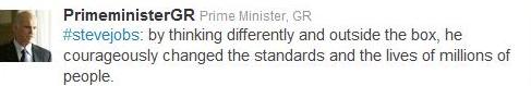 Στο θάνατο του συνιδρυτή της Apple, Στιβ Τζομπς, αναφέρθηκε με tweet του ο πρωθυπουργός, Γ. Παπανδρέου.