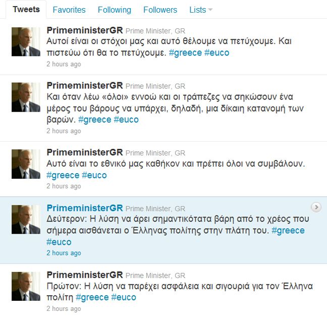 Αυτά αναφέρει ο πρωθυπουργός Γ. Παπανδρέου με μήνυμα του μέσω του twitter, μία πρακτική που ακολουθεί συχνά πυκνά τον τελευταίο καιρό για να μας προετοιμάζει για το τι μέλλει γενέσθαι.