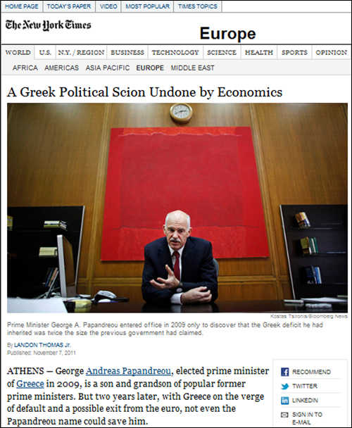 Στο χείλος της χρεοκοπίας και με την έξοδο της Ελλάδας από το ευρώ να φαντάζει πιο ρεαλιστικό σενάριο παρά ποτέ «ούτε το επώνυμο του Παπανδρέου δεν μπορούσε να τον σώσει», γράφει για τον Γιώργο Παπανδρέου η αμερικανική εφημερίδα New York Times.