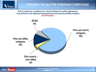 Επίσης, το 75% των ψηφοφόρων της Νέας Δημοκρατίας θεωρούν σωστή την απόφαση του Αντώνη Σαμαρά να συμφωνήσει στη δημιουργία κυβέρνησης εθνικής συνεργασίας.
