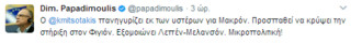 Στην ανάρτησή του, ο κ. Παπαδημούλης αναφέρει: «Ο @kmitsotakis πανηγυρίζει εκ των υστέρων για Μακρόν. Προσπαθεί να κρύψει την στήριξη στον Φιγιόν. Εξομοιώνει Λεπέν-Μελανσόν. Μικροπολιτική!».