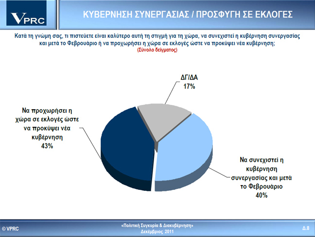 Στο ερώτημα για προσφυγή στις κάλπες τον Φεβρουάριο ή παράταση της κυβέρνησης Παπαδήμου με συνεργασία των κομμάτων, οι πολίτες εμφανίζονται διχασμένοι.