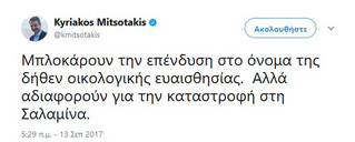 «Μπλοκάρουν την επένδυση στο όνομα της δήθεν οικολογικής ευαισθησίας. Αλλά, αδιαφορούν για την καταστροφή στη Σαλαμίνα», έγραψε στο λογαριασμό του ο πρόεδρος της αξιωματικής αντιπολίτευσης.