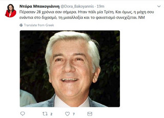 «Πέρασαν 28 χρόνια σαν σήμερα. Ηταν πάλι μία Τρίτη. Και όμως, η μάχη σου ενάντια στο διχασμό, τη μισαλλοξία και το φανατισμό συνεχίζεται» έγραψε.