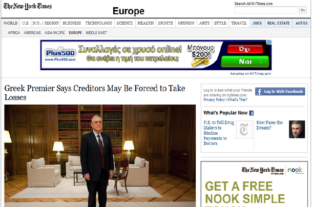 Σε συνέντευξη που παραχώρησε στην Εφημερίδα New York Times ο πρωθυπουργός Λουκάς Παπαδήμος, δήλωσε ότι εξετάζει το ενδεχόμενο οι ιδιώτες πιστωτές να εξαναγκασθούν να δεχθούν απώλειες, εάν δεν καταφέρουν να καταλήξουν σε συμφωνία.