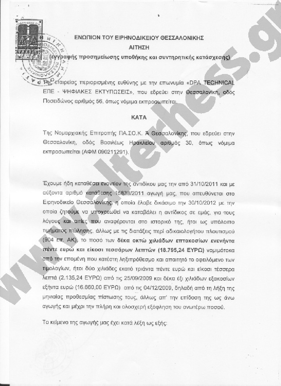 Σύμφωνα με την αγωγή της επιχείρησης στο Ειρηνοδικείο Θεσσαλονίκης ,η Νομαρχιακή του ΠΑΣΟΚ καλείται να καταβάλει τα οφειλόμενα δύο τιμολογίων: