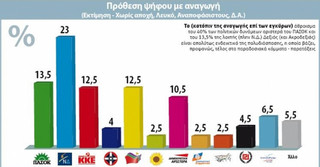 Από την εκτίμηση της πρόθεσης ψήφου με αναγωγή (χωρίς λευκό, αποχή, αναποφάσιστοι, δεν απαντώ) προκύπτουν τα εξής ποσοστά: ΠΑΣΟΚ 13,5%, Ν.Δ. 23%, ΚΚΕ 12,5%, ΛΑΟΣ 4%, ΣΥΡΙΖΑ 12,5%, Οικολόγοι Πράσινοι 2,5%, Δημοκρατική Συμμαχία 2,5%, Δημοκρατική Αριστερά 10,5%, Άρμα Πολιτών 2,5%, Ανεξάρτητοι Έλληνες 6,5% και Χρυσή Αυγή 4,5%.