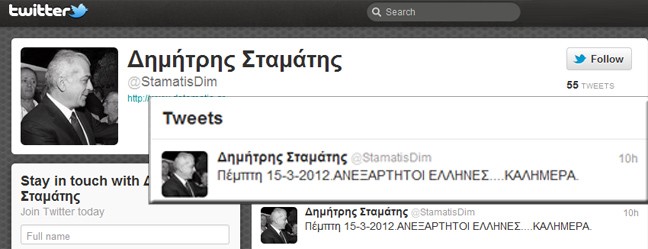 Με το μήνυμα «Πέμπτη 15-03-2012 Ανεξάρτητοι Έλληνες καλημέρα» ο κ. Σταμάτης τάχθηκε στο πλευρό του κ. Καμμένου, ακολουθώντας το παράδειγμα και των υπόλοιπων ανταρτών της ΝΔ όπως η Έλενα Κουντουρά, ο Παναγιώτης Μελάς, ο Χρήστος Ζώης, ο Κώστας Μαρκόπουλος και Γιάννης Μανώλης.