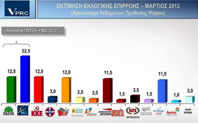 Συγκεκριμένα, σύμφωνα με την δημοσκόπηση στην πρόθεση ψήφου η ΝΔ συγκεντρώνει 22,5%, το ΠΑΣΟΚ αλλά και το ΚΚΕ 12,5%, ο ΣΥΡΙΖΑ 12%, η Δημοκρατική Αριστερά το11,5%, οι Ανεξάρτητοι Έλληνες 11%, το ΛΑΟΣ 3%, η Χρυσή Αυγή 3,5%, οι Οικολόγοι Πράσινοι 2,5%, η Δημοκρατική2%, η ΑΝΤΑΡΣΙΑ 1,5%, η Δράση 1,0%, το Άρμα Πολιτών 1,5% και άλλο κόμμα 3,0%.