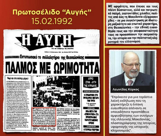 Η ΝΔ, με ανακοίνωσή της, υπενθυμίζει πρωτοσέλιδο της εφημερίδας «Αυγή» την επομένη του συλλαλητηρίου της Θεσσαλονίκης το 1992, όπου υπάρχει το εξής κείμενο: «Με ωριμότητα που έπεισε και τους πλέον δύσπιστους, αλλά και πατριωτικό παλμό, εκατοντάδες χιλιάδες πολίτες απ’ όλη τη Μακεδονία εξέφρασαν χθες -σε μία συγκέντρωση με ιδιαίτερη μαζικότητα και ενωτικό χαρακτήρα στη Θεσσαλονίκη- την εθνική ευαισθησία τους και την αποφασιστικότητά τους να προασπίσουν την ακεραιότητα, την ιστορία και την πολιτιστική κληρονομία του Ελληνισμού».