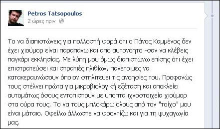 «Το να διαπιστώνεις για πολλοστή φορά ότι ο Πάνος Καμμένος δεν έχει χιούμορ είναι παραπάνω και από αυτονόητο -σαν να κλέβεις παγκάρι εκκλησίας. Με λύπη μου όμως διαπιστώνω επίσης ότι έχει επιστρατεύσει και στρατιές ηλιθίων, πανέτοιμες να κατακεραυνώσουν όποιον στηλιτεύει τις ανοησίες του. Προφανώς τους στέλνει πρώτα για μικροβιολογική εξέταση και αποκλείει αυτομάτως όσους εντοπιστούν με ύποπτα ιχνοστοιχεία χιούμορ στα ούρα τους. Το να τους μπλοκάρω όλους από τον “τοίχο” μου είναι μάταιο. Οφείλω άλλωστε να φροντίζω και για τη ψυχαγωγία μας».