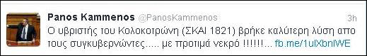 Από την πλευρά του ο Π. Καμμένος μέσω του λογαριασμού του στο Twitter τόνισε ότι «ο υβριστής του Κολοκοτρώνη βρήκε καλύτερη λύση από τους συγκυβερνώντες… με προτιμά νεκρό».