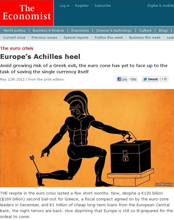 Την ευρωκρίση αναλύει στην έντυπη έκδοση το βρετανικό περιοδικό «The Economist». Στο άρθρο, που τιτλοφορείται «Η αχίλλειος πτέρνα της Ευρώπης» και προδημοσιεύεται σήμερα στην ιστοσελίδα του, ο Economist τονίζει ότι αν και το ρίσκο αποχώρησης της Ελλάδας είναι ιδιαίτερα υψηλό, η ευρωζώνη ακόμη δεν έχει καταφέρει να προετοιμαστεί επαρκώς για τη διάσωση του ίδιου του κοινού νομίσματος.