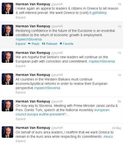 Ακόμα και το λογαριασμό του στο Twitter χρησιμοποιεί ο πρόεδρος της ΕΕ Χέρμαν βαν Ρομπάι για να μας… συνετίσει. Έτσι «καλεί» τους πολίτες και τους πολιτικούς της Ελλάδας να αφήσουν να επικρατήσει η λογική εν όψει των εκλογών. «Θέλουμε την Ελλάδα στο ευρώ, με την προϋπόθεση να τηρήσει τις δεσμεύσεις της» σημειώνει.