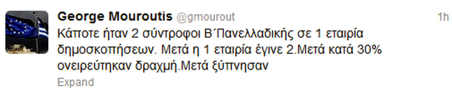 Συγκεκριμένα, ο κ. Μουρούτης έγραψε στο twitter: Κάποτε ήταν 2 σύντροφοι Β΄Πανελλαδικής σε 1 εταιρία δημοσκοπήσεων. Μετά η 1 εταιρία έγινε 2.Μετά κατά 30% ονειρεύτηκαν δραχμή.Μετά ξύπνησαν.