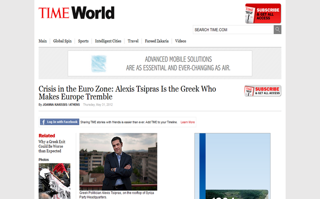 «Πριν μερικές εβδομάδες ο 37χρονος Αλέξης Τσίπρας ήταν ένας μικρός πολιτικός της αντιπολίτευσης. Σήμερα διαταράσσει την Ευρωπαϊκή Ένωση καθώς το αριστερό κόμμα του ΣΥΡΙΖΑ – κόμμα που περιέχει από μετριοπαθείς σοσιαλιστές μέχρι σκληρούς κομμουνιστές – ενδέχεται να κληθεί να σχηματίσει κυβέρνηση μετά τις εκλογές της 17ης Ιουνίου», γράφει το περιοδικό TIME αναφερόμενο στον πρόεδρο του ΣΥΡΙΖΑ, παραθέτοντας μία σύνεντευξη του αρχηγού του ΣΥΡΙΖΑ.