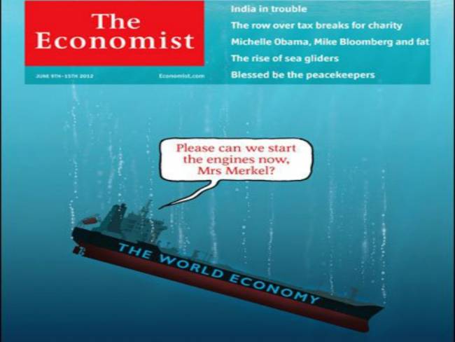 Η φωτογραφία του δημοσιεύματος χαρακτηριστική: ένα καράβι που βουλιάζει -ήδη να σημειώσουμε κάτω από την επιφάνεια της θάλασσας-, που αναπαριστά την παγκόσμια οικονομία, και από μέσα ακούγεται μια δραματική έκκληση «σας παρακαλούμε κυρία Μέρκελ μπορούμε τώρα να βάλουμε μπρος τη μηχανή;».