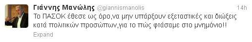 Για όρο του ΠΑΣΟΚ, να μην γίνει εξεταστική για το μνημόνιο, προκειμένου να συμμετέχει στην κυβέρνηση, κάνει λόγο ο Γ. Μανώλης. Το πρώην στέλεχος της ΝΔ, που αυτή τη φορά δεν μπήκε στη Βουλή με τους Ανεξάρτητους Έλληνες, αποφάσισε να σχολιάσει μέσω twitter τη νέα κυβέρνηση.