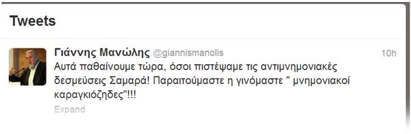 Δριμεία επίθεση τόσο κατά του υπουργικού συμβουλίου όσο και κατά του ίδιου του πρωθυπουργού, Αντώνη Σαμαρά εξαπέλυσε μέσω twitter ο πρώην «γαλάζιος» και νυν τομεάχης εργασίας των Ανεξάρτητων Ελλήνων, Γιάννης Μανώλης.