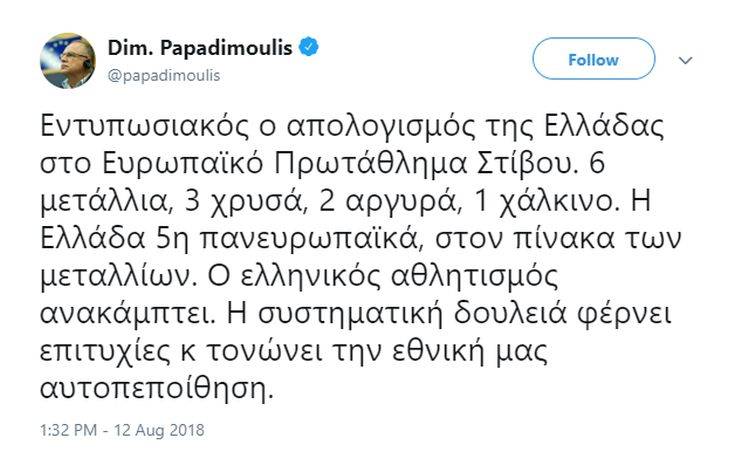 «Εντυπωσιακός ο απολογισμός της Ελλάδας στο Ευρωπαϊκό Πρωτάθλημα Στίβου. 6 μετάλλια, 3 χρυσά, 2 αργυρά, 1 χάλκινο. Η Ελλάδα 5η πανευρωπαϊκά, στον πίνακα των μεταλλίων. Ο ελληνικός αθλητισμός ανακάμπτει. Η συστηματική δουλειά φέρνει επιτυχίες κ τονώνει την εθνική μας αυτοπεποίθηση» σημειώνει ο Δ. Παπαδημούλης.