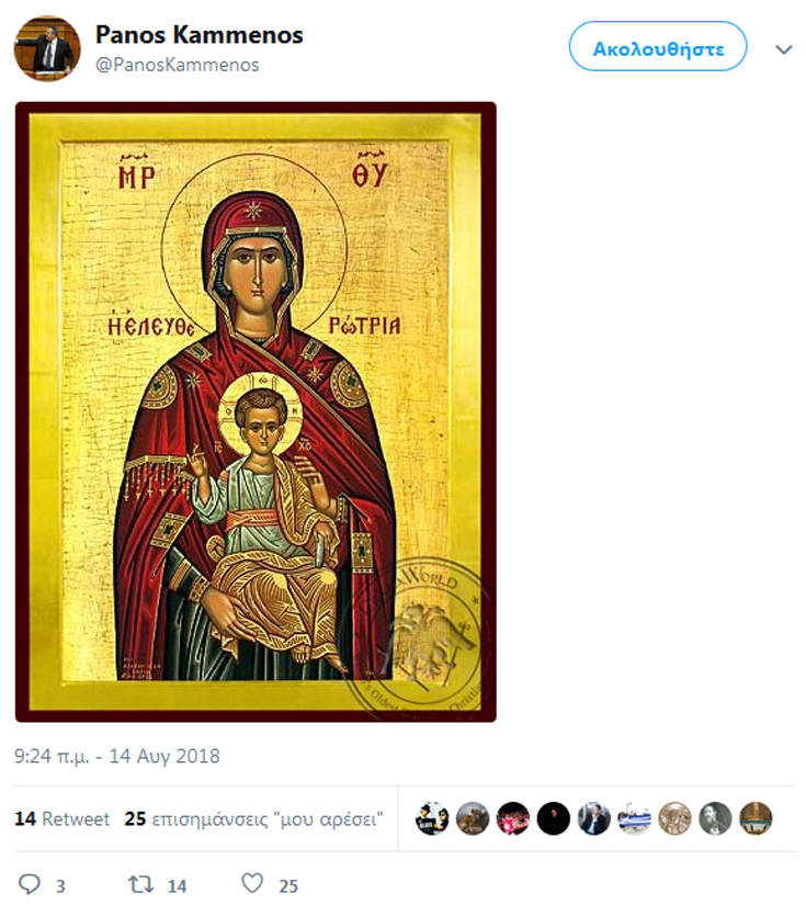 Μια μόνο εικόνα, εκείνη της Παναγίας της Ελευθερώτριας, ανάρτησε ο υπουργός Άμυνας και πρόεδρος των Ανεξάρτητων Ελλήνων Πάνος Καμμένος, λίγη ώρα μετά την ανακοίνωση της απελευθέρωσης των δύο ελλήνων στρατιωτικών που είχαν συλληφθεί σε απαγορευμένη στρατιωτική περιοχή και κρατούνταν από τον Μάρτιο στις φυλακές της Αδριανούπολης. Το tweet του κ. Καμμένου δεν συνοδεύεται από κάποιο σχόλιο…