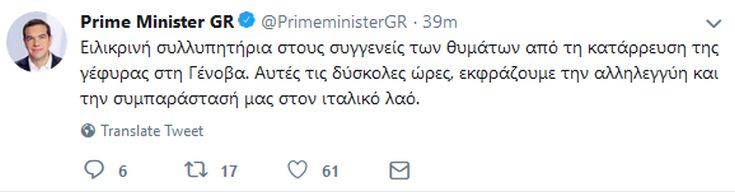 Τα συλλυπητήρια του στους συγγενείς των θυμάτων από την κατάρρευση της γέφυρας στη Γένοβα, μαζί με την αλληλεγγύη και τη συμπαράσταση στον ιταλικό λαό, εκφράζει ο πρωθυπουργός, Αλέξης Τσίπρας, με ανάρτηση του στο Twitter. «Ειλικρινή συλλυπητήρια στους συγγενείς των θυμάτων από τη κατάρρευση της γέφυρας στη Γένοβα. Αυτές τις δύσκολες ώρες, εκφράζουμε την αλληλεγγύη και την συμπαράστασή μας στον ιταλικό λαό», έγραψε ο πρωθυπουργός.