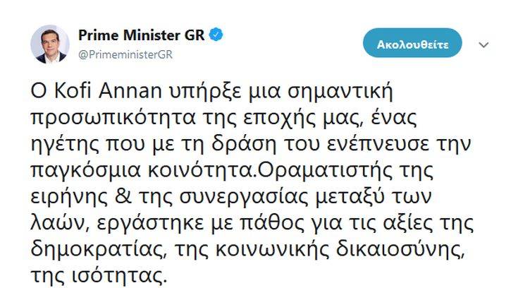 «Ο Kofi Annan υπήρξε μια σημαντική προσωπικότητα της εποχής μας, ένας ηγέτης που με τη δράση του ενέπνευσε την παγκόσμια κοινότητα», έγραψε ο Αλέξης Τσίπρας στον λογαριασμό του πρωθυπουργού στο Twitter, με αφορμή την απώλεια του πρώην γενικού γραμματέα του Οργανισμού Ηνωμένων Εθνών. Και συμπλήρωσε: «Οραματιστής της ειρήνης & της συνεργασίας μεταξύ των λαών, εργάστηκε με πάθος για τις αξίες της δημοκρατίας, της κοινωνικής δικαιοσύνης, της ισότητας».