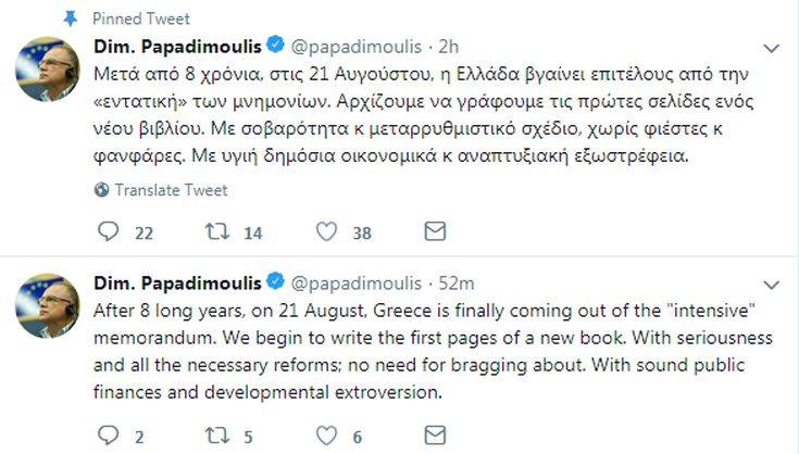«Μετά από 8 χρόνια, στις 21 Αυγούστου, η Ελλάδα βγαίνει επιτέλους από την “εντατική” των μνημονίων. Αρχίζουμε να γράφουμε τις πρώτες σελίδες ενός νέου βιβλίου. Με σοβαρότητα και μεταρρυθμιστικό σχέδιο, χωρίς φιέστες και φανφάρες. Με υγιή δημόσια οικονομικά και αναπτυξιακή εξωστρέφεια», γράφει ο επικεφαλής της ευρωομάδας του ΣΥΡΙΖΑ.