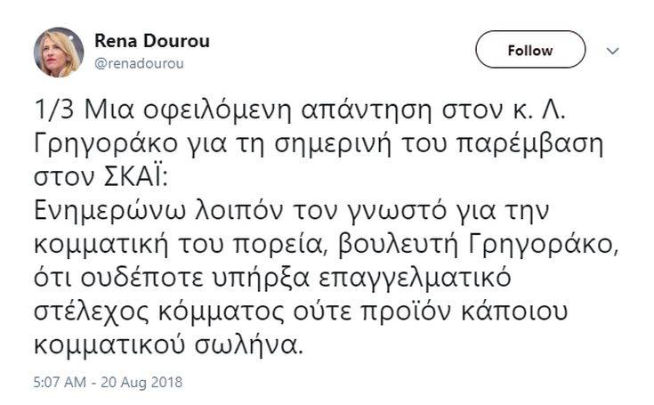 Απάντηση έδωσε μέσω Twitter η περιφερειάρχης Αττικής Ρένα Δούρου στον βουλευτή του ΚΙΝΑΛ Λεωνίδα Γρηγοράκο και όσα εκείνος δήλωσε στον ΣΚΑΪ.