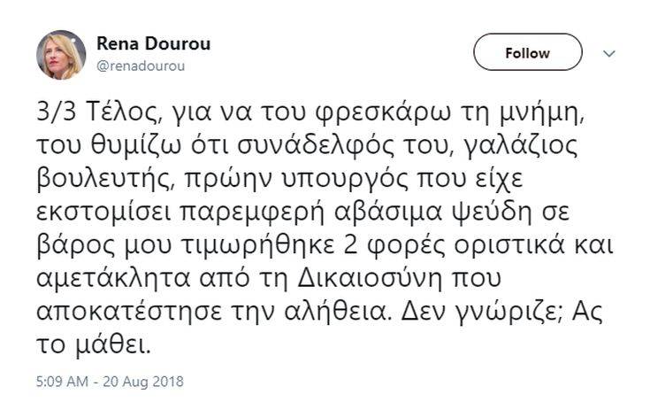Τέλος, για να του φρεσκάρω τη μνήμη, του θυμίζω ότι συνάδελφός του, γαλάζιος βουλευτής, πρώην υπουργός που είχε εκστομίσει παρεμφερή αβάσιμα ψεύδη σε βάρος μου τιμωρήθηκε 2 φορές οριστικά και αμετάκλητα από τη Δικαιοσύνη που αποκατέστησε την αλήθεια. Δεν γνώριζε; Ας το μάθει», καταλήγει η κ. Δούρου, σύμφωνα με το Αθηναϊκό Πρακτορείο Ειδήσεων.