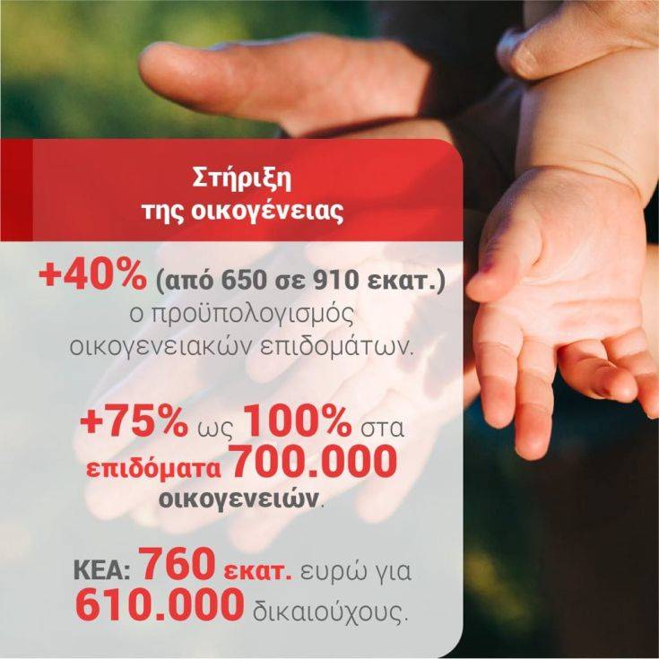 - Στήριξη της οικογένειας: Αύξηση 40% (από 650 σε 910 εκατ.), ο προϋπολογισμός των οικογενειακών επιδομάτων. Αύξηση 75% ως 100% στα επιδόματα 700.000 οικογενειών. ΚΕΑ: 760 εκατ. ευρώ για 610.000 δικαιούχους.