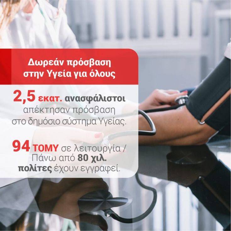 - 2,5 εκατ. ανασφάλιστοι απέκτησαν πρόσβαση στο Δημόσιο Σύστημα Υγείας. 94 ΤΟΜΥ σε λειτουργία/ Πάνω από 80 χιλ. πολίτες έχουν εγγραφεί.