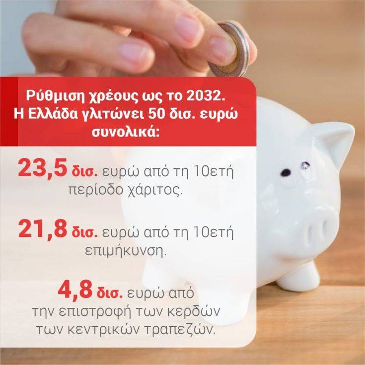 - «Ρύθμιση χρέους ως το 2032. Η Ελλάδα γλυτώνει 50 δισ. ευρώ συνολικά: 23,5 δισ. ευρώ από τη 10ετή περίοδο χάριτος, 21,8 δισ. από τη 10ετή επιμήκυνση, 4,8 δισ. από την επιστροφή των κερδών των κεντρικών τραπεζών».