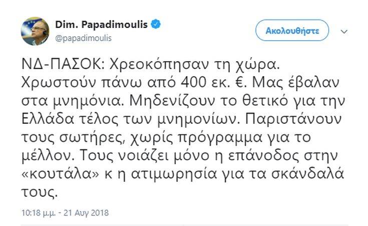Βέλη εναντίον της Νέας Δημοκρατίας και του ΠΑΣΟΚ εξαπέλυσε μέσω ανάρτησής του στο Twitter ο αντιπρόεδρος του Ευρωπαϊκού Κοινοβουλίου, Δημήτρης Παπαδημούλης, ο οποίος κατηγορεί τα δύο κόμματα πως ενώ «χρεοκόπησαν τη χώρα, παριστάνουν τους σωτήρες, χωρίς να έχουν σχέδιο».