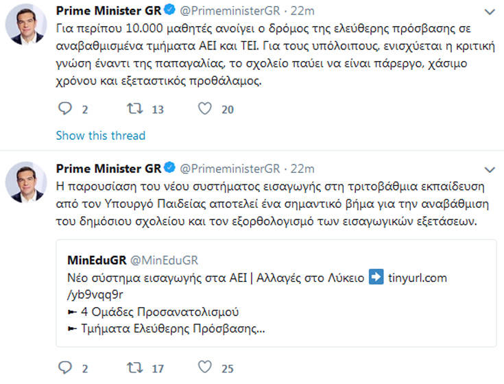Σημαντικό βήμα για την αναβάθμιση του δημόσιου σχολείου και τον εξορθολογισμό των εισαγωγικών εξετάσεων, χαρακτηρίζει το νέο σύστημα εισαγωγής στην τριτοβάθμια εκπαίδευση, ο πρωθυπουργός Αλέξης Τσίπρα σε ανάρτηση του στον προσωπικό του λογαριασμό στο twitter. «Η παρουσίαση του νέου συστήματος εισαγωγής στη τριτοβάθμια εκπαίδευση από τον Υπουργό Παιδείας αποτελεί ένα σημαντικό βήμα για την αναβάθμιση του δημόσιου σχολείου και τον εξορθολογισμό των εισαγωγικών εξετάσεων» σημειώνει ο πρωθυπουργός. Και προσθέτει πως «για περίπου 10.000 μαθητές ανοίγει ο δρόμος της ελεύθερης πρόσβασης σε αναβαθμισμένα τμήματα ΑΕΙ και ΤΕΙ», ενώ «για τους υπόλοιπους, ενισχύεται η κριτική γνώση έναντι της παπαγαλίας, το σχολείο παύει να είναι πάρεργο, χάσιμο χρόνου και εξεταστικός προθάλαμος».